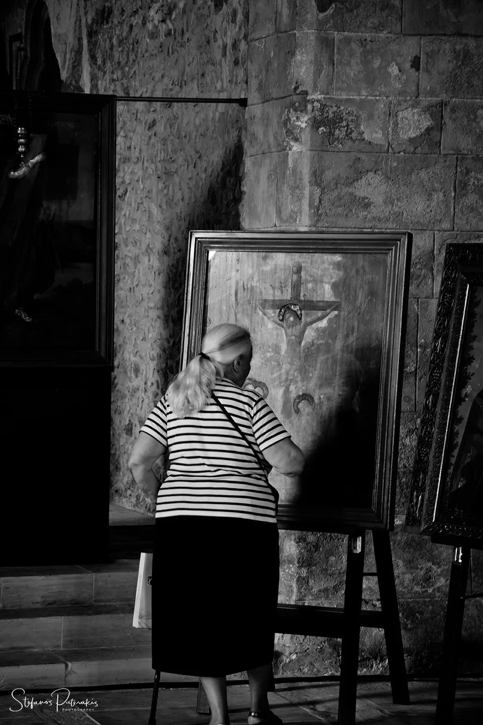 Μπαίνουν στο ναό. Της δίνει ένα κεράκι. Το ανάβει. Σαν μια κίνηση γνωστή. Δεξιά ένα προσκυνητάρι με μια μεγάλη εικόνα της Παναγίας! Αφήνει το χέρι της Αρσινόης, στέκεται μπροστά στην μεγάλη εικόνα και η λιγομίλητη πλέον κ. Ελένη μιλά: